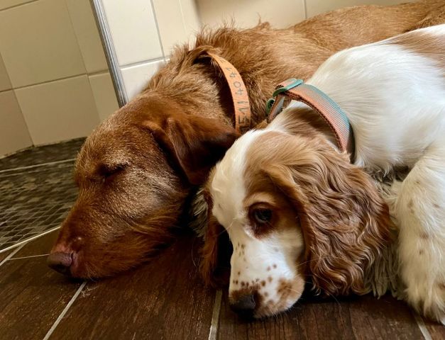 Tilda mit Hero, dem Drahthaar Viszla. Tilda spielt mit Hero